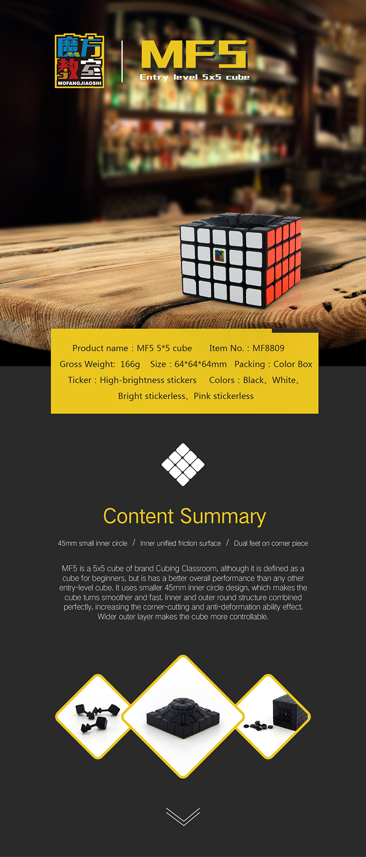 MF5 is a 5x5 cube of brand Cubing Classroom, although it is defined as a cube for beginners, but is has a better overall performance than any other entry-level cube. It uses smaller 45mm inner circle design, which makes the cube turns smoother and fast. Inner and outer round structure combined perfectly, increasing the corner-cutting and anti-deformation ability effect. Wider outer layer makes the cube more controllable.