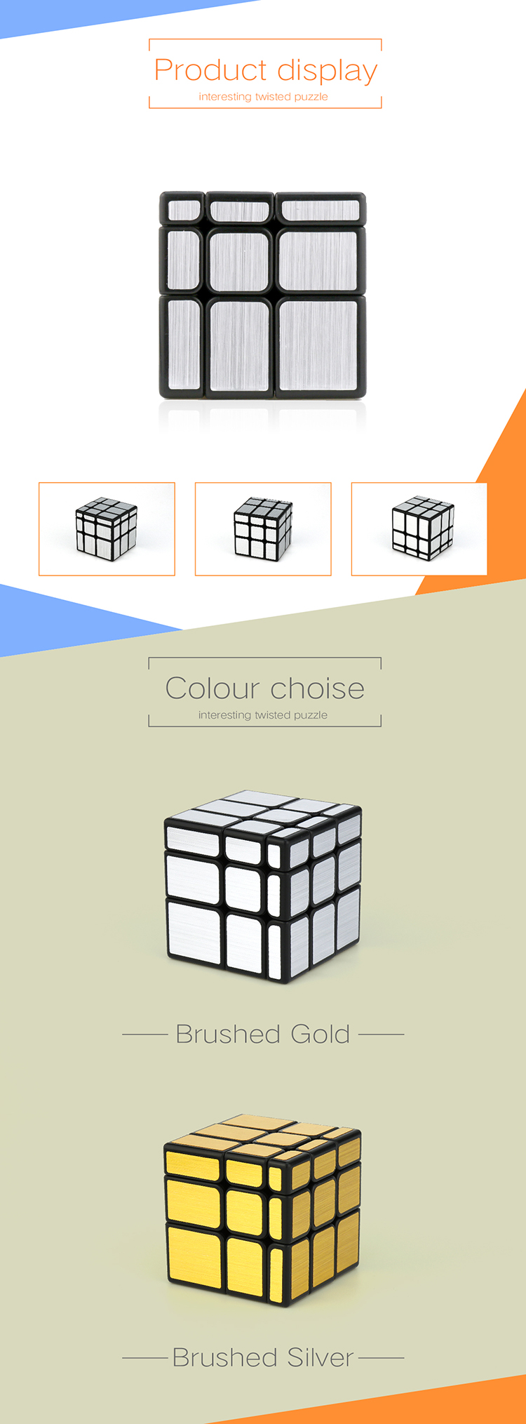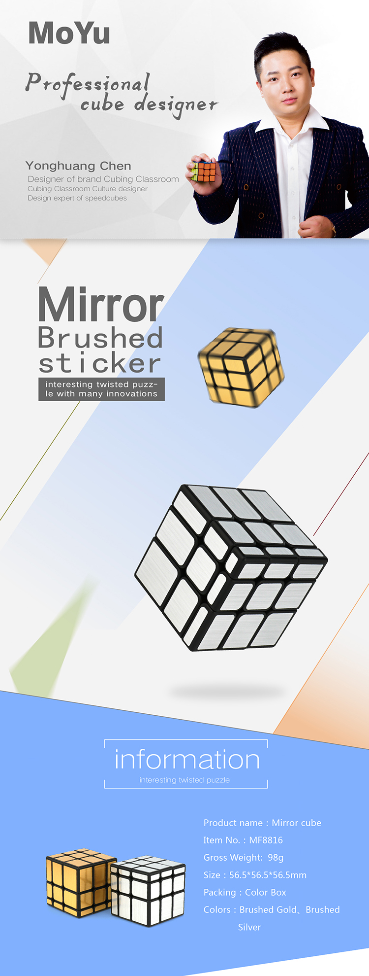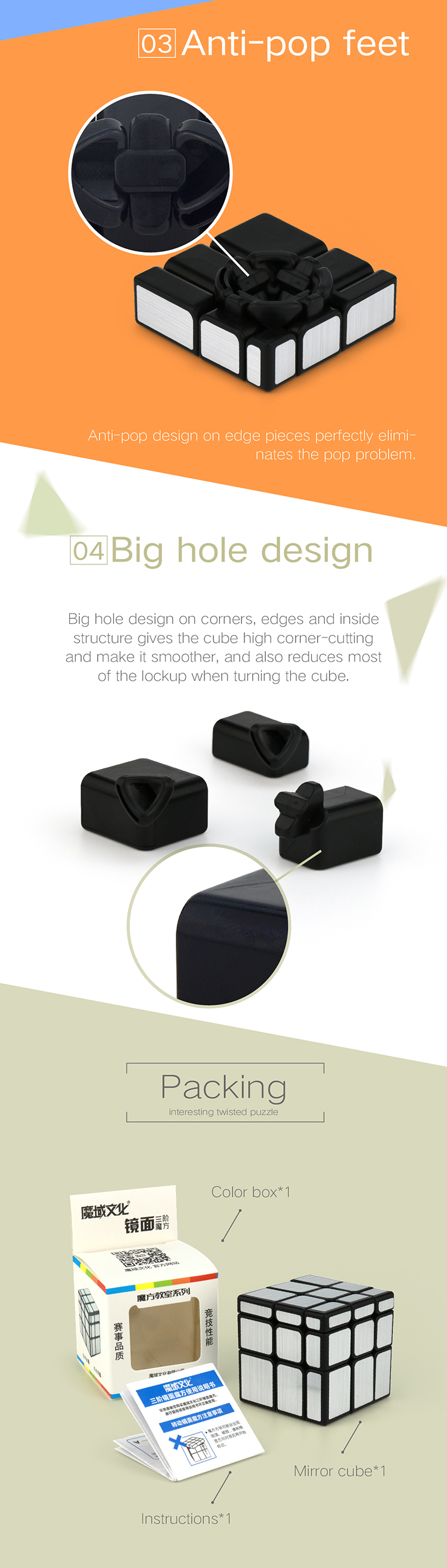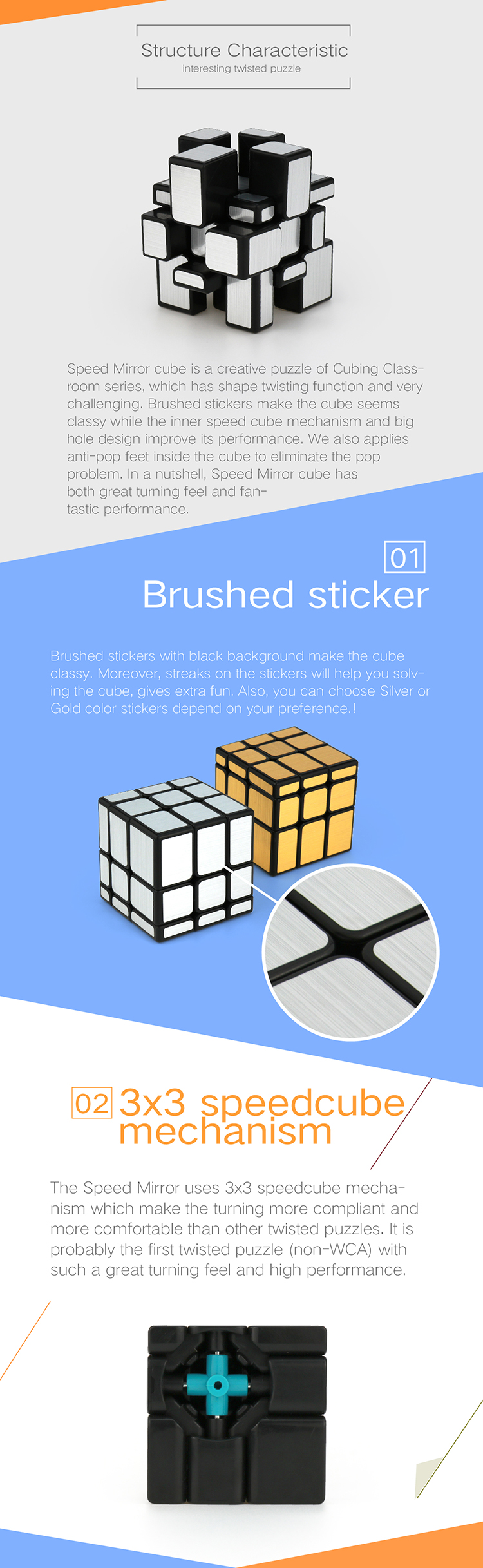 Speed Mirror cube is a creative puzzle of Cubing Classroom series, which has shape twisting function and very challenging. Brushed stickers make the cube seems classy while the inner speed cube mechanism and big hole design improve its performance. We also applies anti-pop feet inside the cube to eliminate the pop problem. In a nutshell, Speed Mirror cube has both great turning feel and fantastic performance.