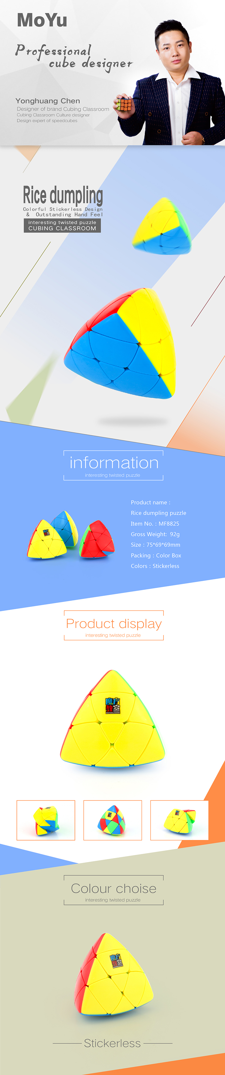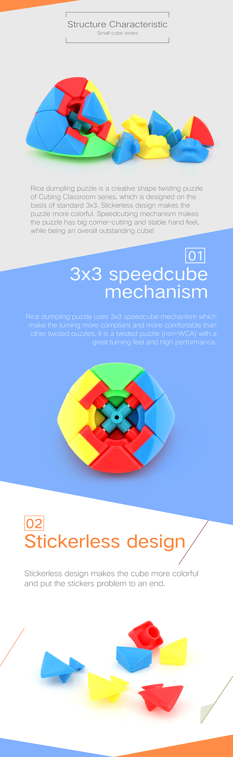 Rice dumpling puzzle is a creative shape twisting puzzle of Cubing Classroom series, which is designed on the basis of standard 3x3. Stickerless design makes the puzzle more colorful. Speedcubing mechanism makes the puzzle has big corner-cutting and stable hand feel, while being an overall outstanding cube!