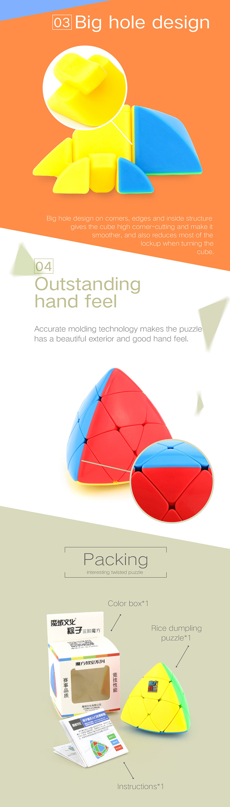 Rice dumpling puzzle uses 3x3 speedcube mechanism which make the turning more compliant and more comfortable than other twisted puzzles. It is a twisted puzzle (non-WCA) with a great turning feel and high performance.