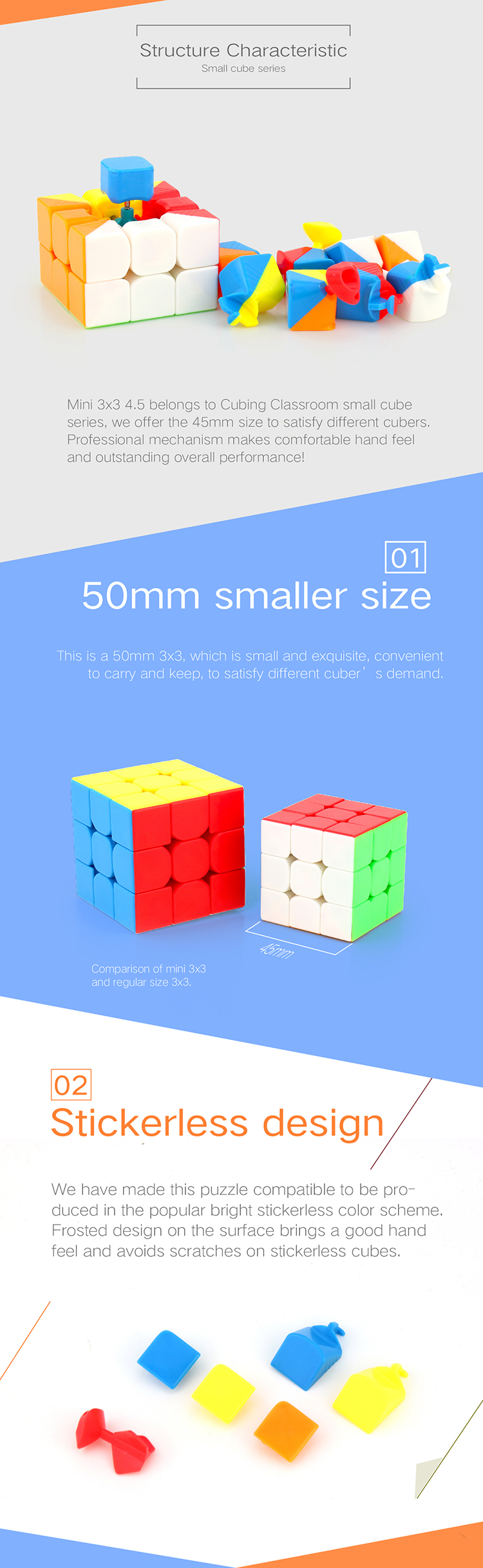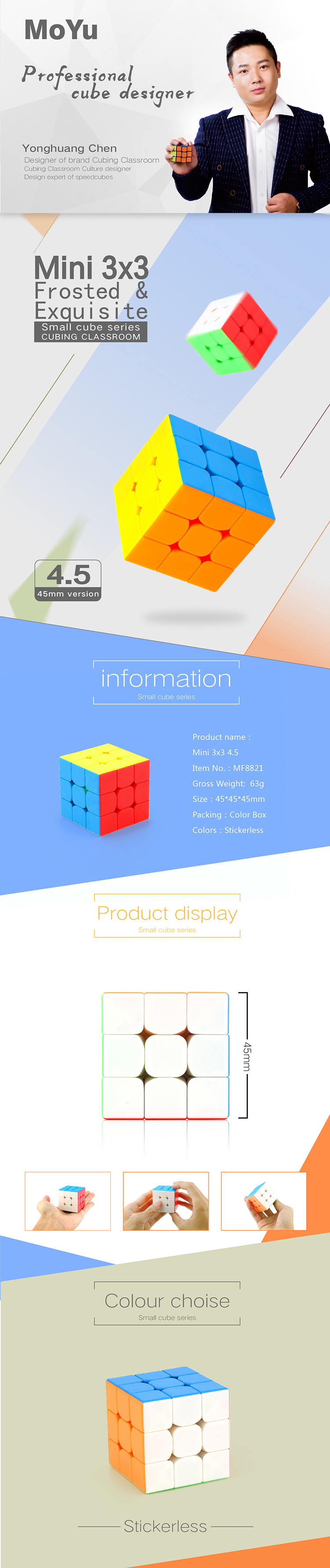 Mini 3x3 4.5 belongs to Cubing Classroom small cube series, we offer the 45mm size to satisfy different cubers. Professional mechanism makes comfortable hand feel and outstanding overall performance!
