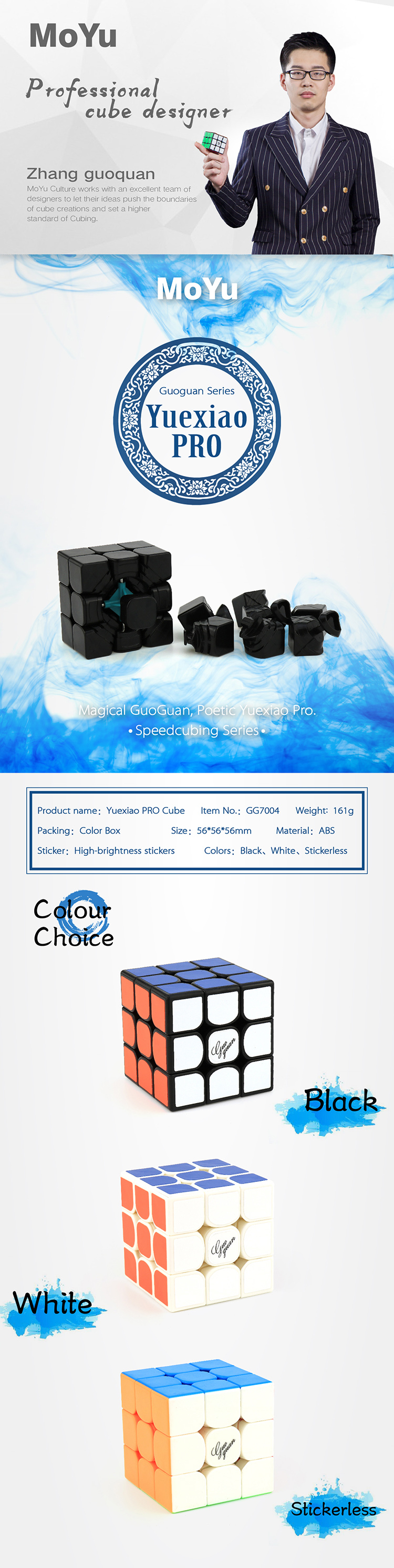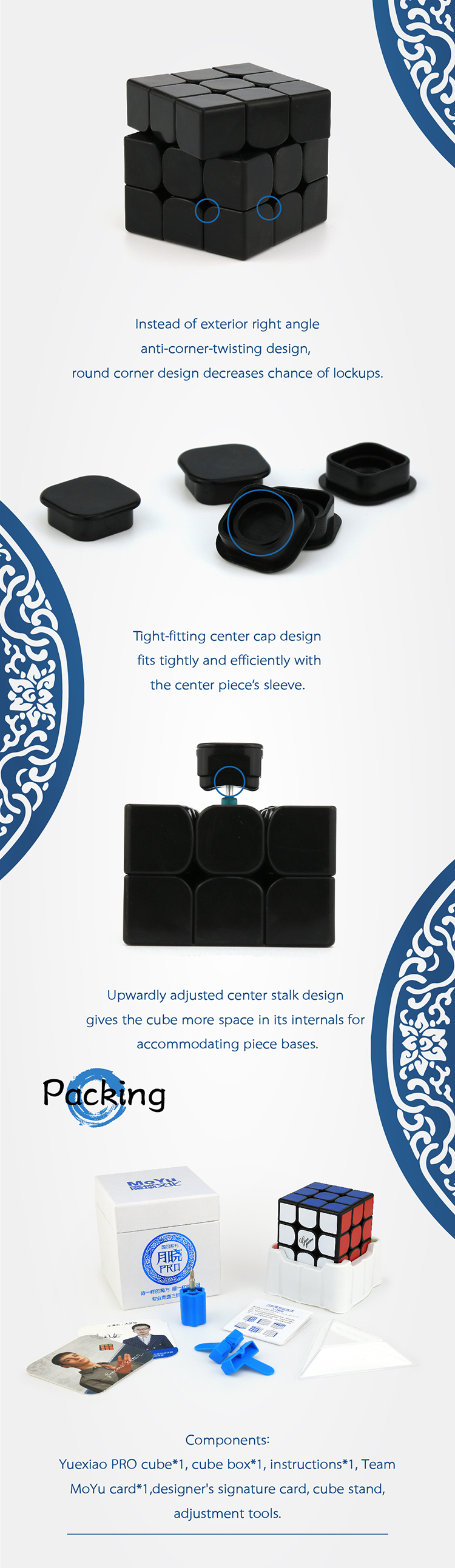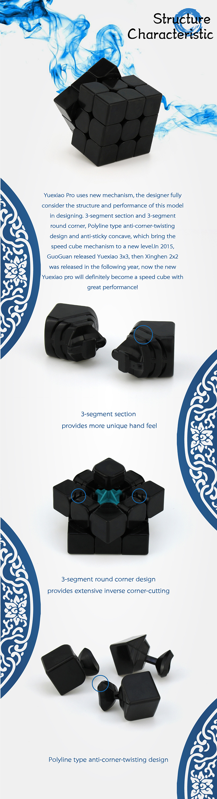 Yuexiao Pro uses new mechanism, the designer fully consider the structure and performance of this model in designing. 3-segment section and 3-segment round corner, Polyline type anti-corner-twisting design and anti-sticky concave, which bring the speed cube mechanism to a new level. In 2015, GuoGuan released Yuexiao 3x3, then Xinghen 2x2 was released in the following year, now the new Yuexiao pro will definitely become a speed cube with great performance! |