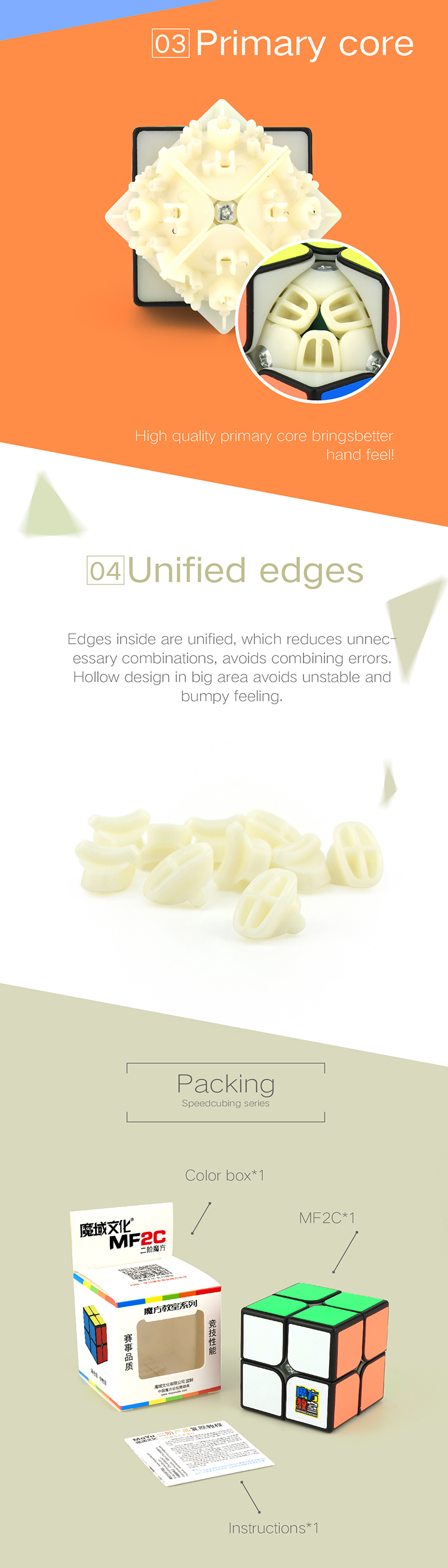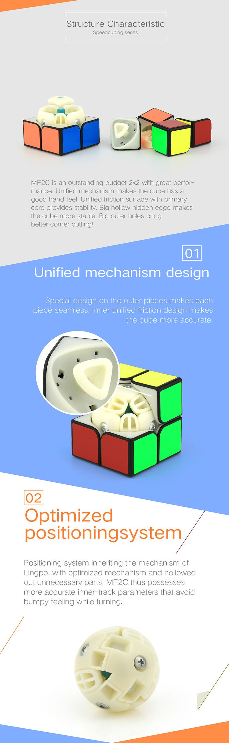 MF2C is an outstanding budget 2x2 with great performance. Unified mechanism makes the cube has a good hand feel. Unified friction surface with primary core provides stability. Big hollow hidden edge makes the cube more stable. Big outer holes bring better corner cutting!