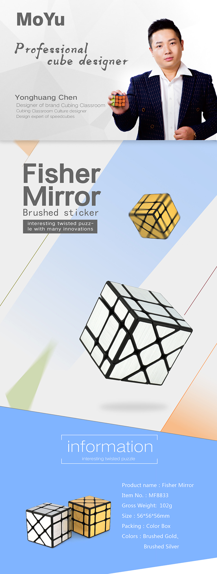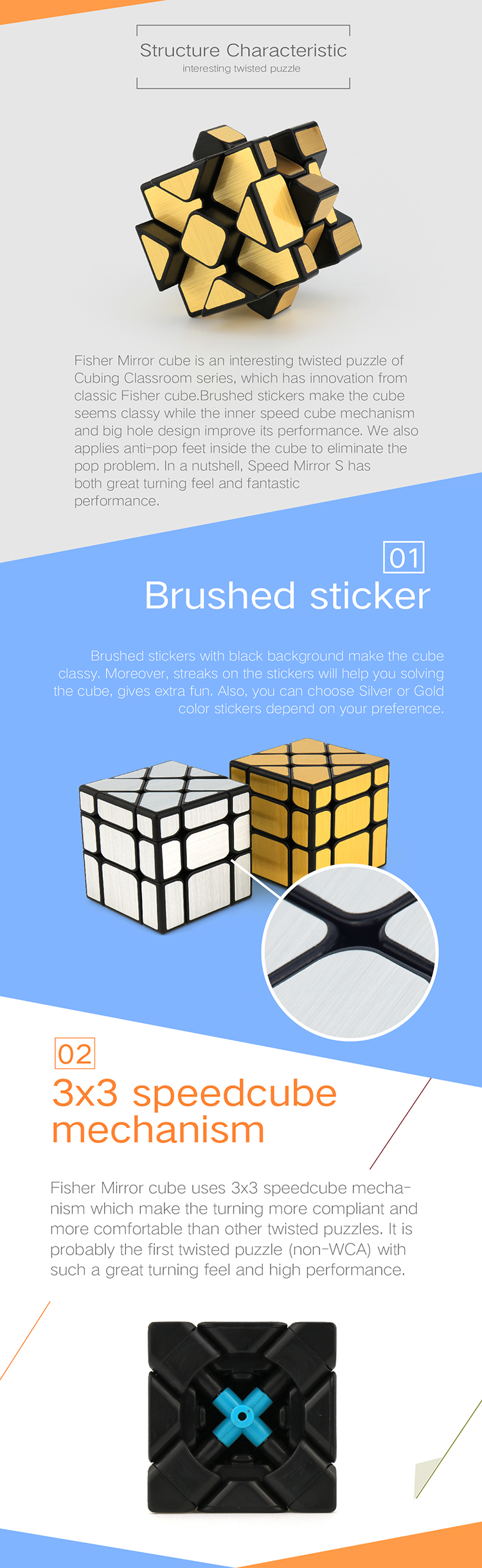 Fisher Mirror cube is an interesting twisted puzzle of Cubing Classroom series, which has innovation from classic Fisher cube.Brushed stickers make the cube seems classy while the inner speed cube mechanism and big hole design improve its performance. We also applies anti-pop feet inside the cube to eliminate the pop problem. In a nutshell, Speed Mirror S has both great turning feel and fantastic performance.