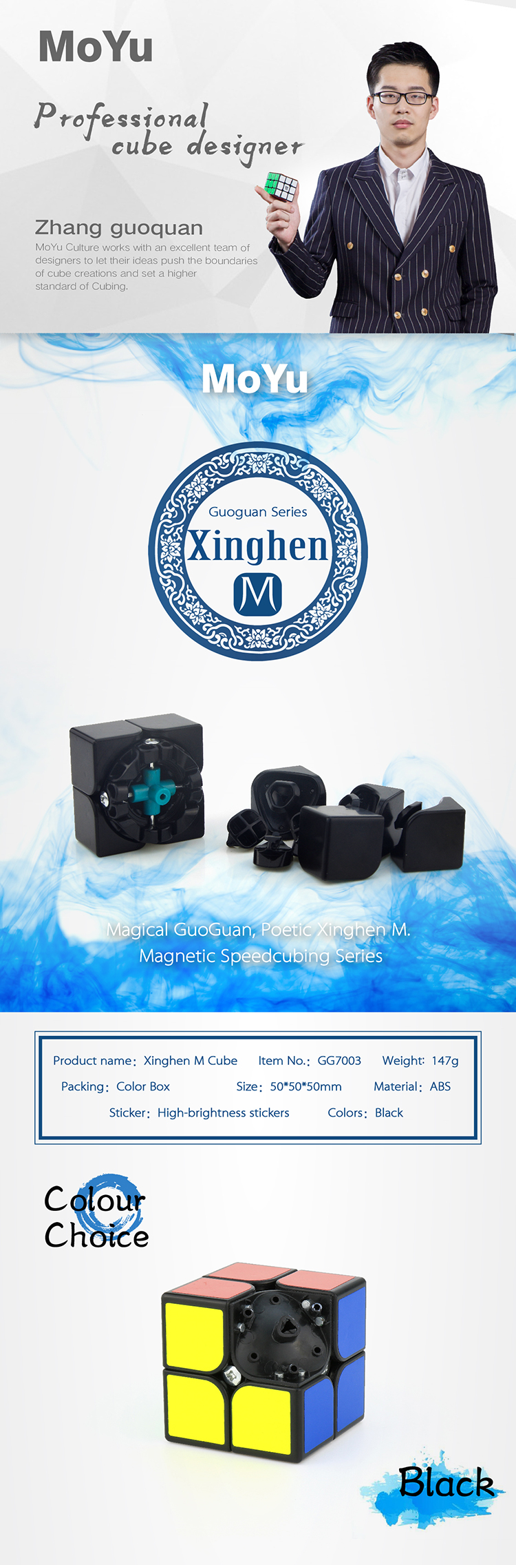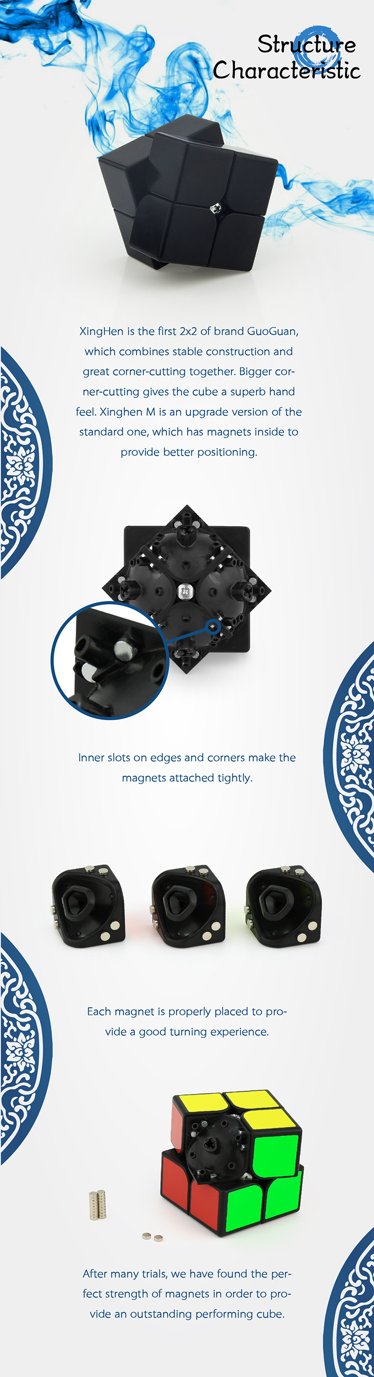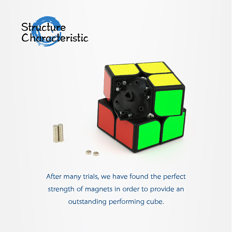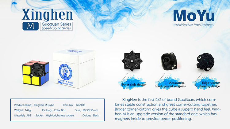 XingHen is the first 2x2 of brand GuoGuan, which combines stable construction and great corner-cutting together. Bigger corner-cutting gives the cube a superb hand feel. Xinghen M is an upgrade version of the standard one, which has magnets inside to provide better positioning. Inner slots design. Inner slots on edges and corners make the magnets attached tightly. Accurately, hand-placed magnets. Each magnet is properly placed to provide a good turning experience. Suitable magnetic force. After many trials, we have found the perfect strength of magnets in order to provide an outstanding performing cube. Anti-pop feet. Anti-pop feet on the bottom of hidden edge provides an outstanding anti-pop effect. Edge-center positioning design. 3 positioning hidden edges and 3 center piece is the positioning system of this 2x2, which is convenient and efficient. Tightness of 6 faces is controllable, bringing a more stable feel. Unified edge piece. Unified edge piece design avoids deformation and brings more stability!