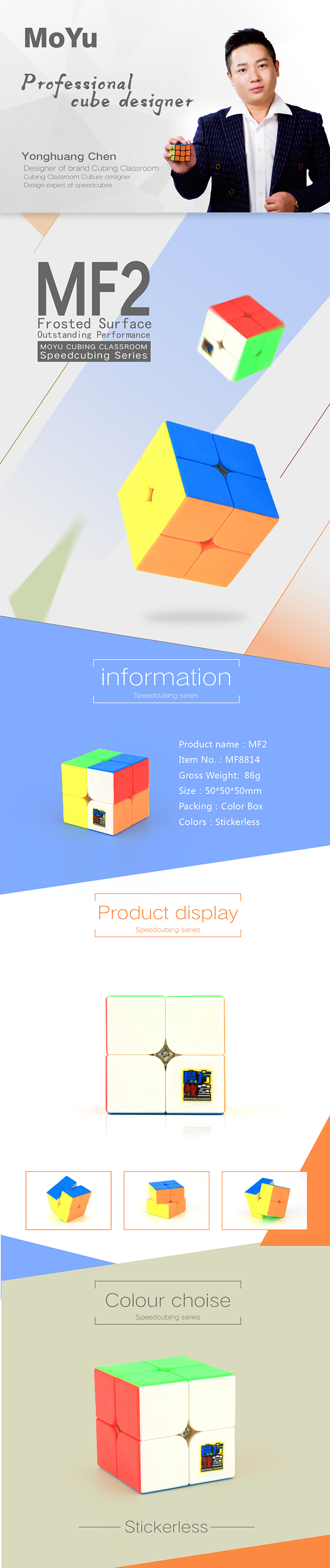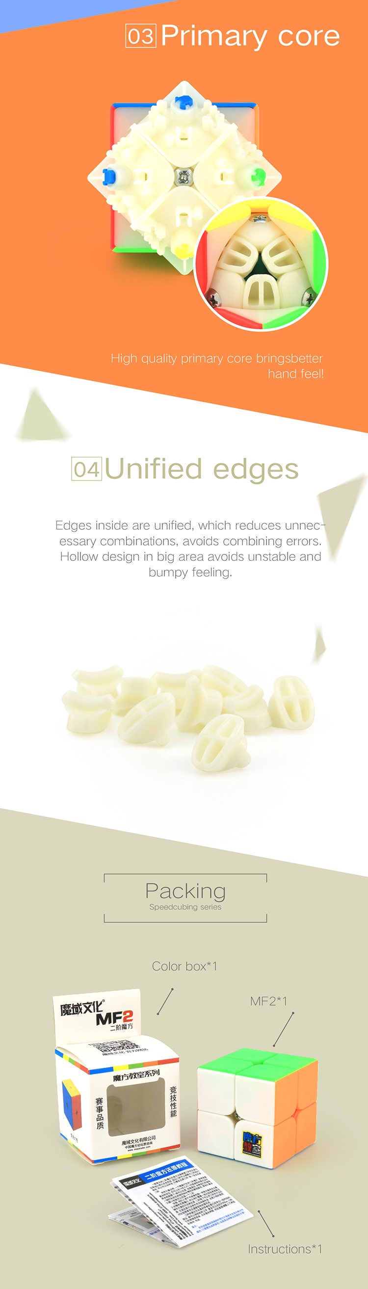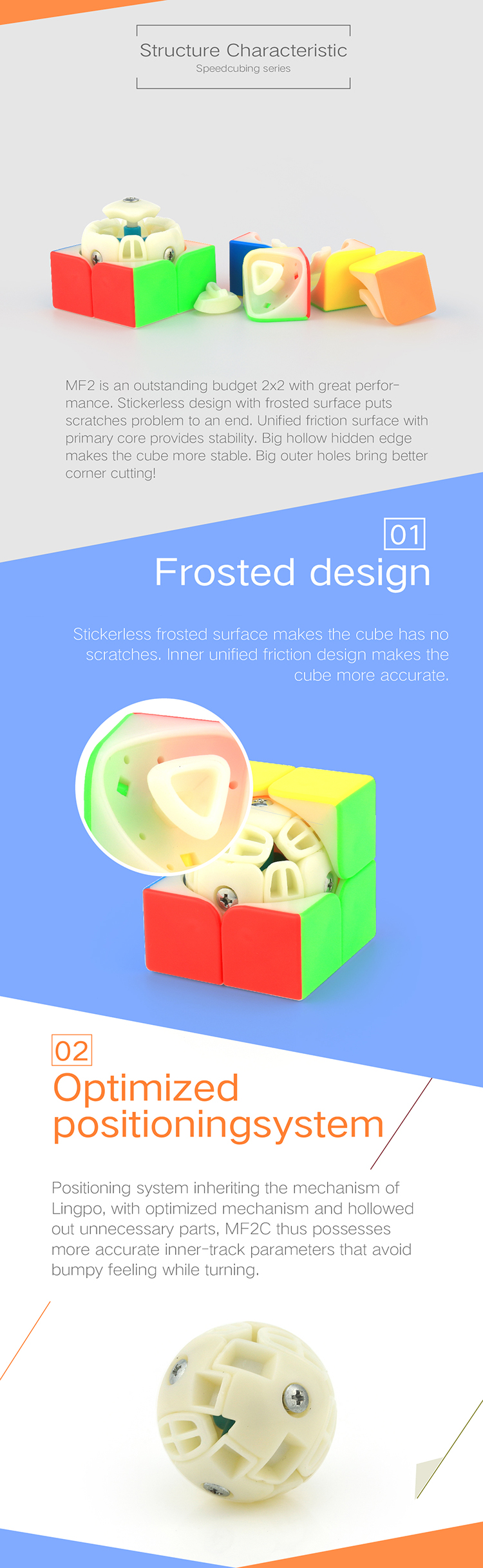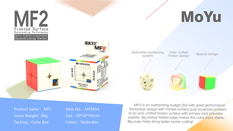 MF2 2x2 Frosted Surface Outstanding Performance. MF2 is an outstanding budget 2x2 with great performance. Stickerless design with frosted surface puts scratches problem to an end. Unified friction surface with primary core provides stability. Big hollow hidden edge makes the cube more stable. Big outer holes bring better corner cutting! Optimized positioning system Positioning system inheriting the mechanism of Lingpo, with optimized mechanism and hollowed out unnecessary parts, MF2 thus possesses more accurate inner-track parameters that avoid bumpy feeling while turning. Frosted design Stickerless frosted surface makes the cube has no scratches. Inner unified friction design makes the cube more accurate. Unified edges Edges inside are unified, which reduces unnecessary combinations, avoids combining errors. Hollow design in big area avoids unstable and bumpy feeling. Primary core. High quality primary core brings better hand feel! |