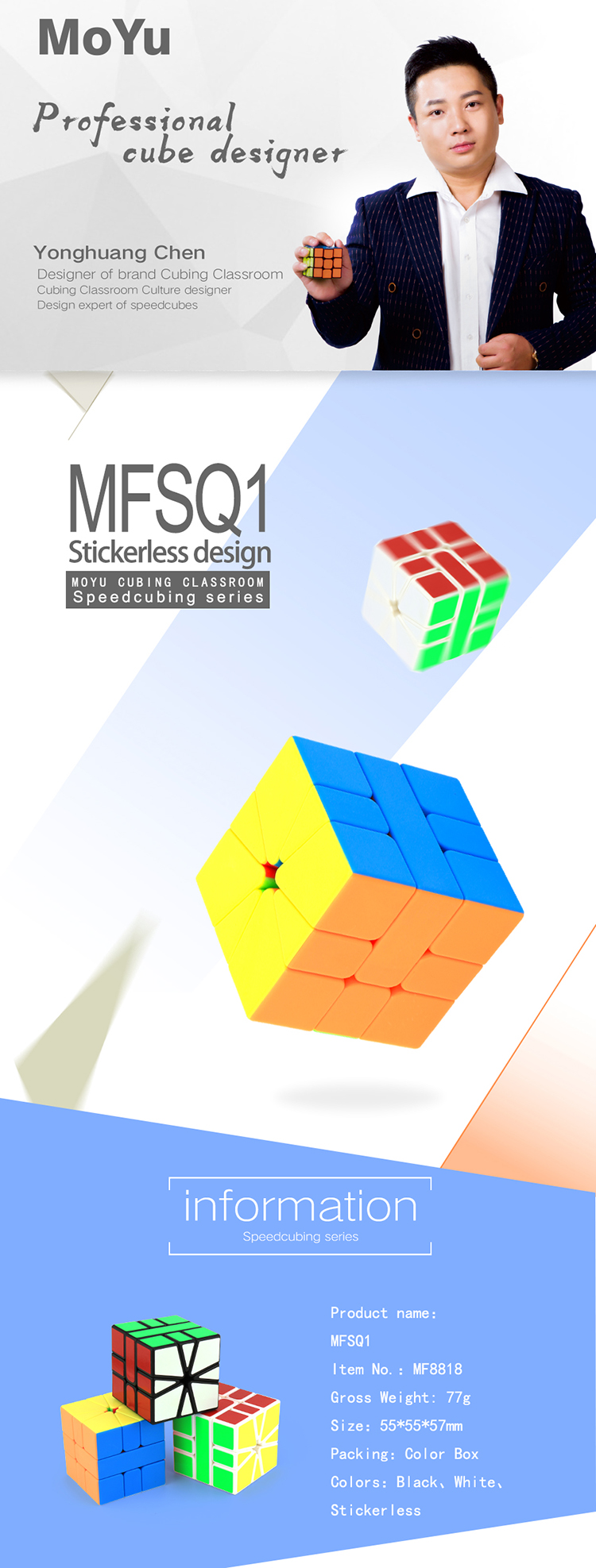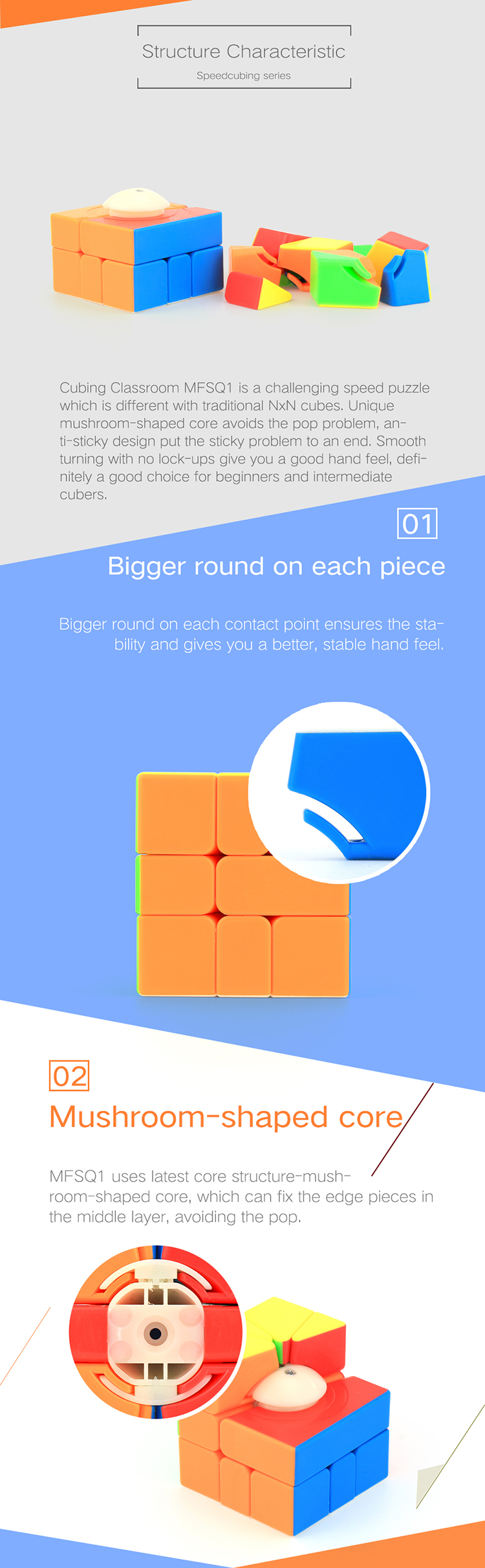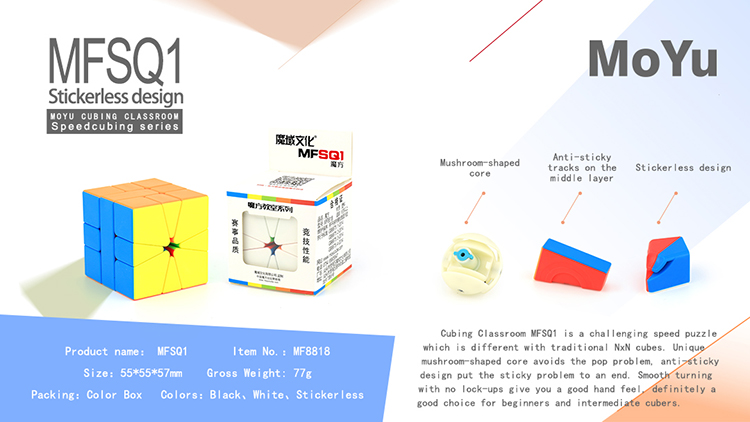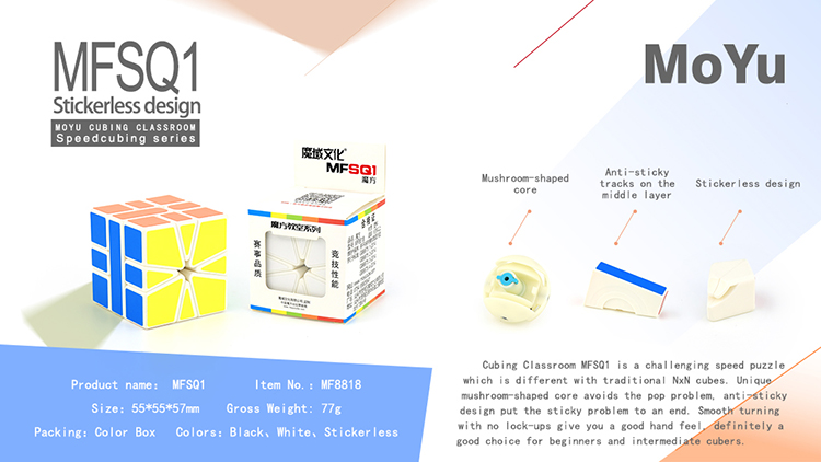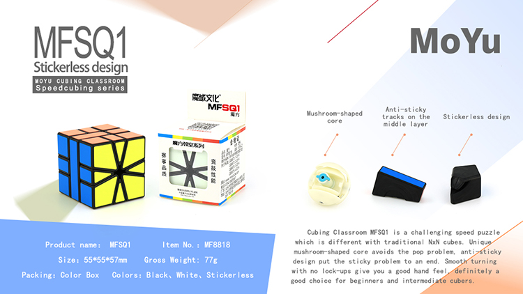 MFSQ1 Speedcubing series. Stickerless design, extraordinary entry-level SQ1 Cubing Classroom MFSQ1 is a challenging speed puzzle which is different with traditional NxN cubes. Unique mushroom-shaped core avoids the pop problem, anti-sticky design put the sticky problem to an end. Smooth turning with no lock-ups give you a good hand feel, definitely a good choice for beginners and intermediate cubers. Mushroom-shaped core
