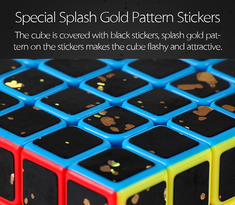 The cube is covered with black stickers, splash gold pattern on the stickers makes the cube flashy and attractive.