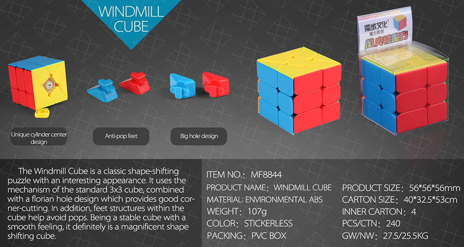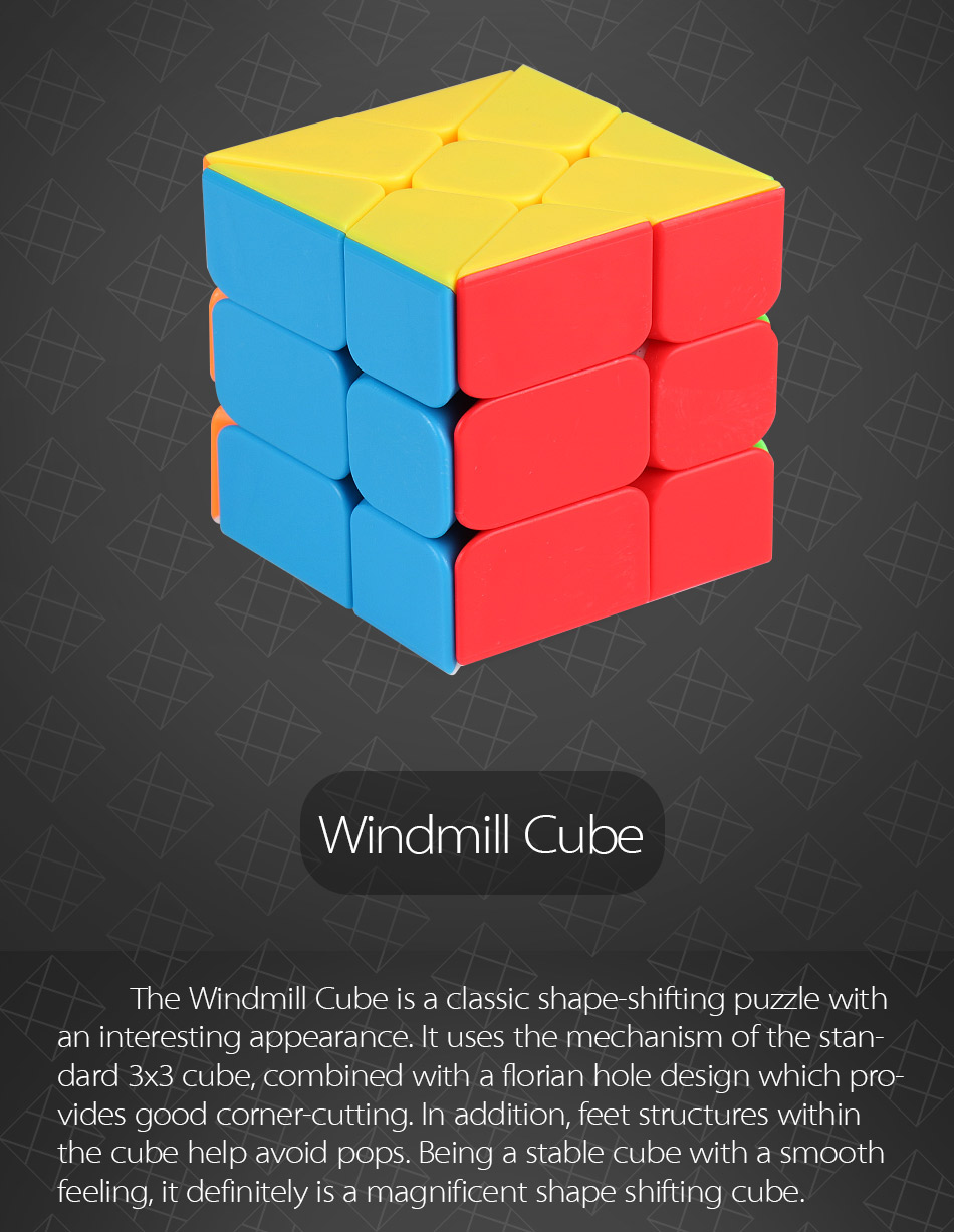 The Windmill Cube is a classic shape-shifting puzzle with an interesting appearance. It uses the mechanism of the standard 3x3 cube, combined with a florian hole design which provides good corner-cutting. In addition, feet structures within the cube help avoid pops. Being a stable cube with a smooth feeling, it definitely is a magnificent shape shifting cube.
