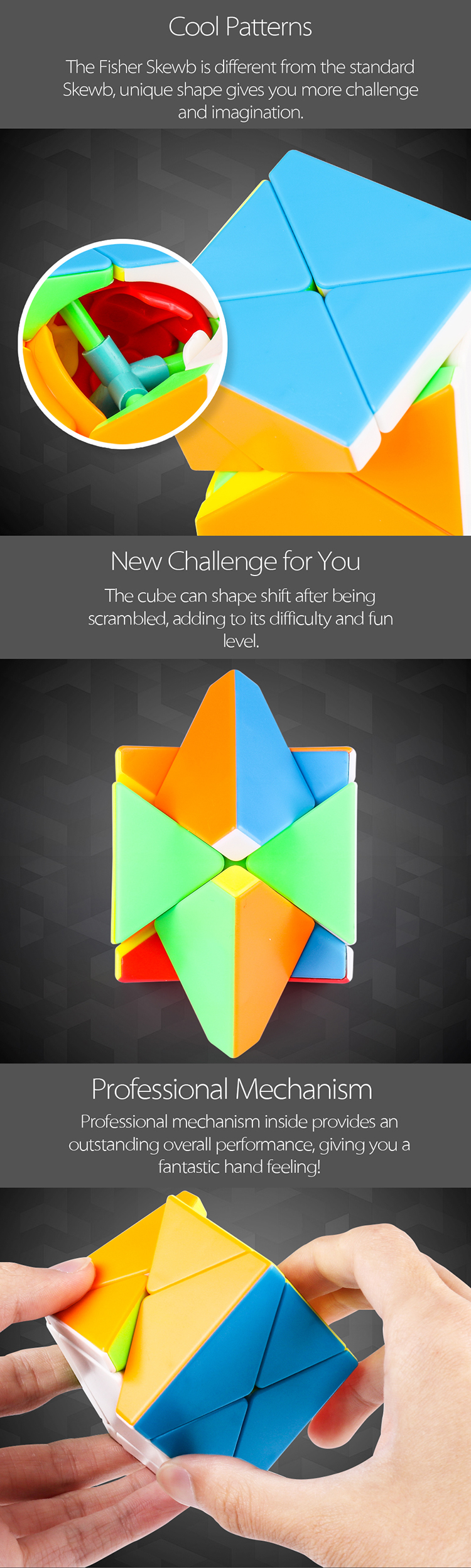 Cool Patterns. The Fisher Skewb is different from the standard Skewb, unique shape gives you more challenge and imagination.