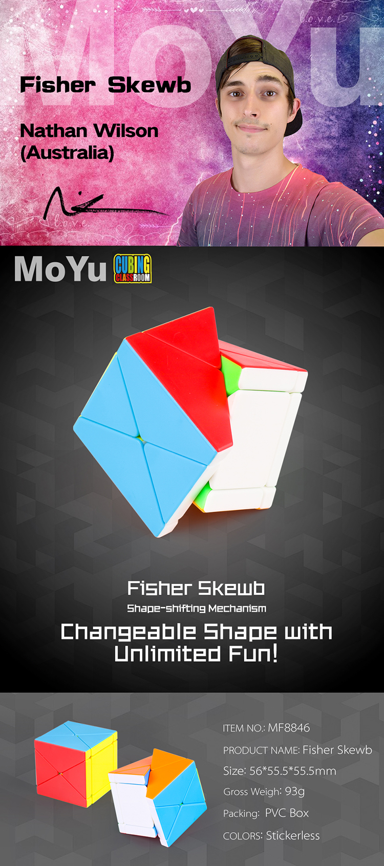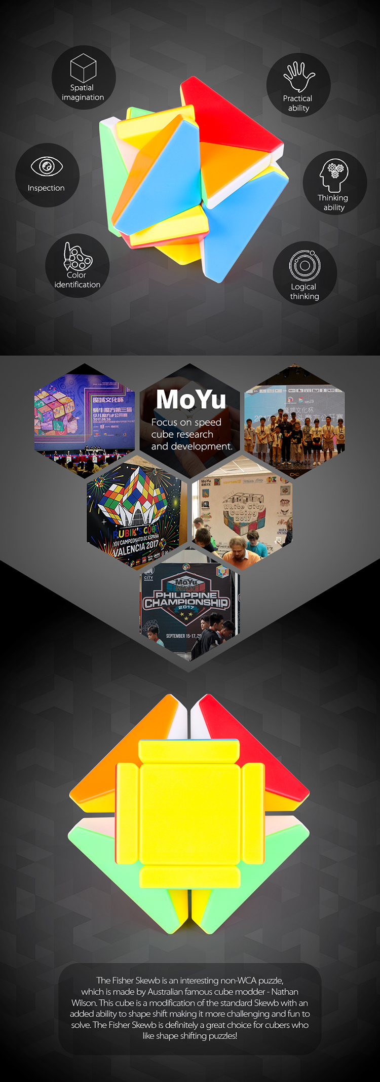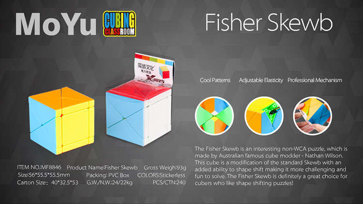 Fisher Skewb Changeable Shape with Unlimited Fun! The Fisher Skewb is an interesting non-WCA puzzle, which is made by Australian famous cube modder - Nathan Wilson. This cube is a modification of the standard Skewb with an added ability to shape shift making it more challenging and fun to solve. The Fisher Skewb is definitely a great choice for cubers who like shape shifting puzzles!