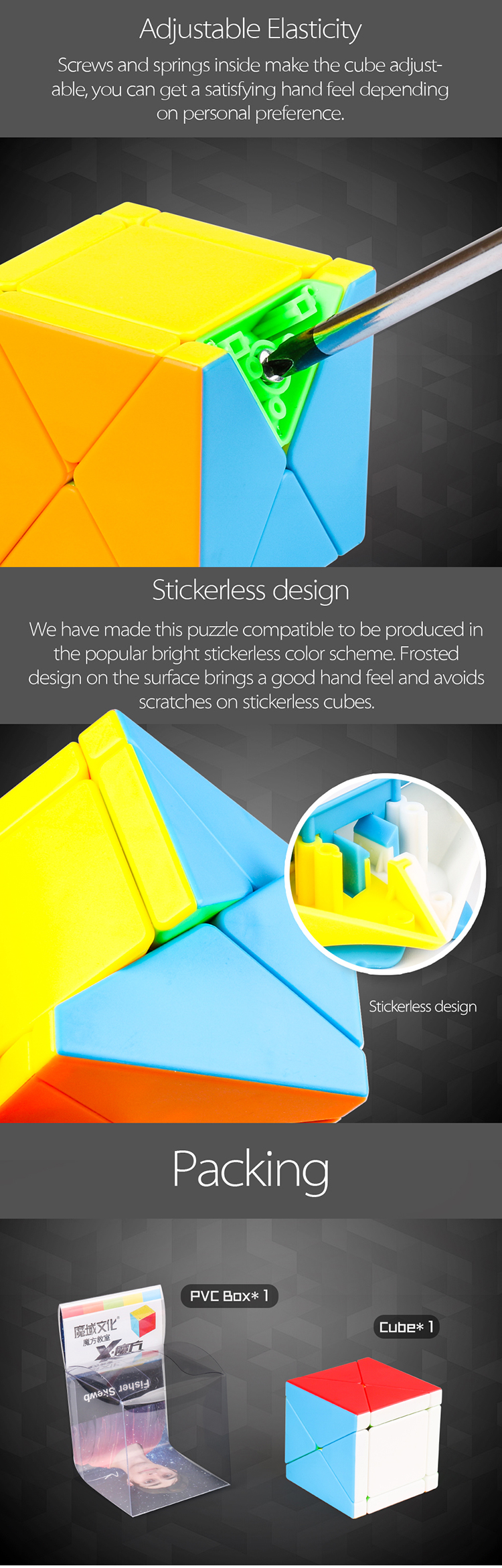 Stickerless design. We have made this puzzle compatible to be produced in the popular bright stickerless color scheme. Frosted design on the surface brings a good hand feel and avoids scratches on stickerless cubes.