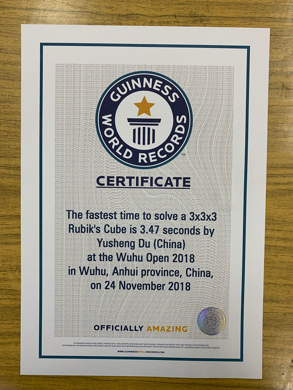 Guinness World Records Certification! Yusheng Du 3x3x3 cube 3.47 seconds world record single!